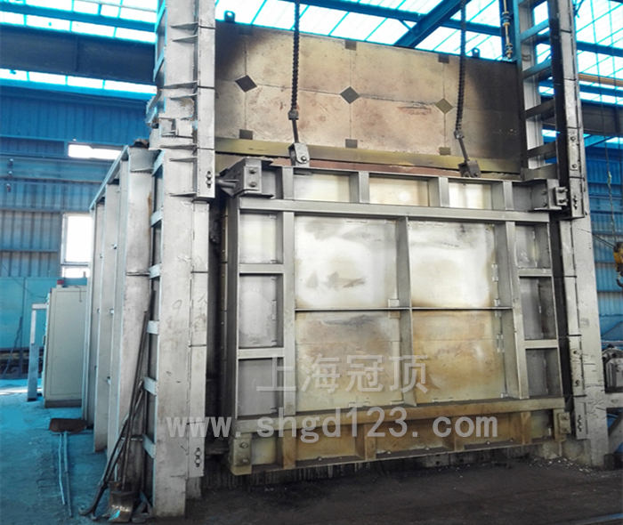 臺車采用重載結(jié)構(gòu),密封槽為自動提升式沙封機(jī)構(gòu)減少臺車爐的熱損失,臺車由大功率動力系統(tǒng)帶動。臺車上安裝有鉻錳氮耐熱鋼爐底板或1200℃碳化硅爐底板承載工件。